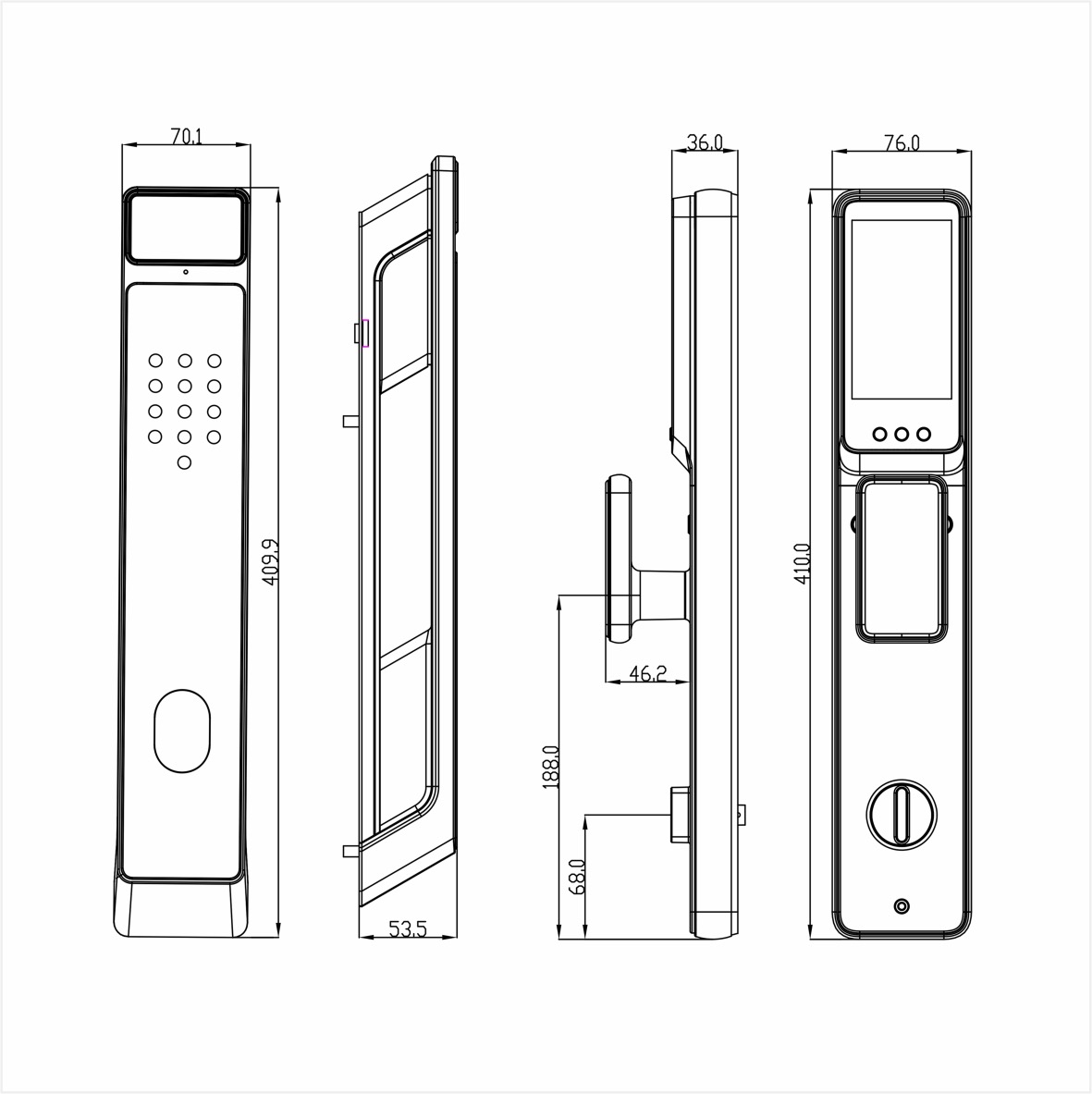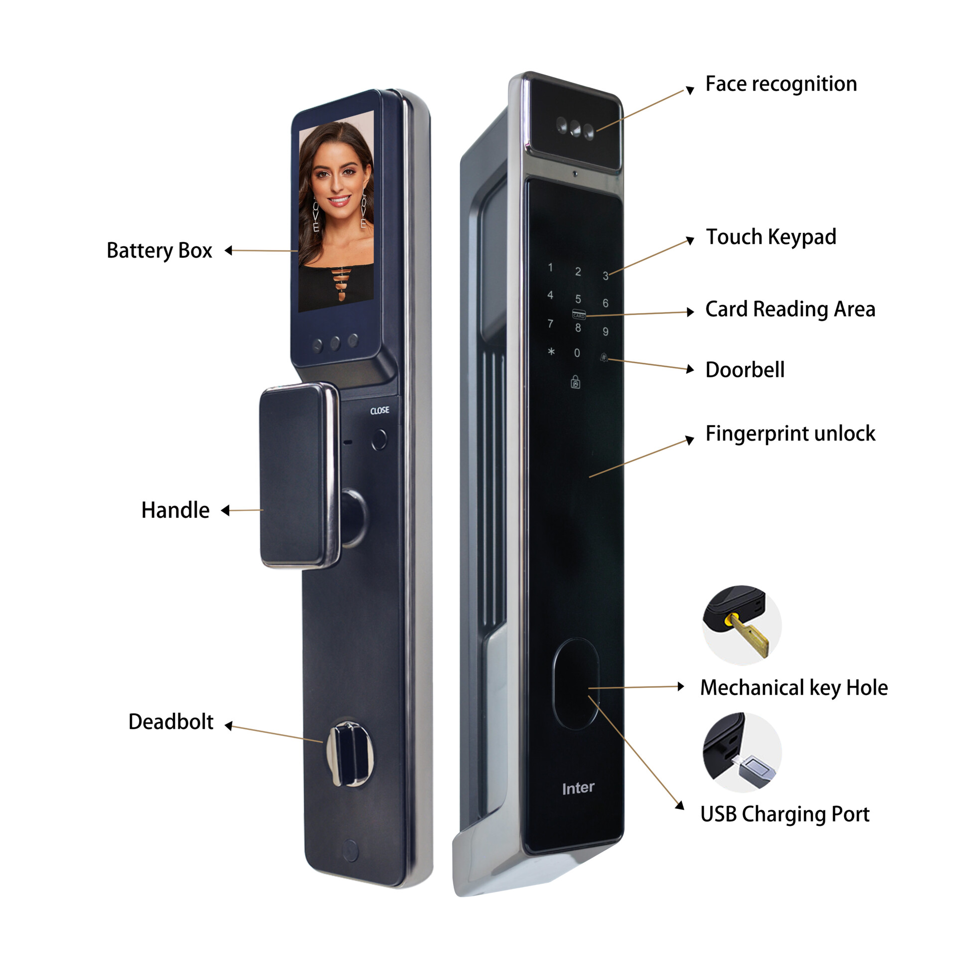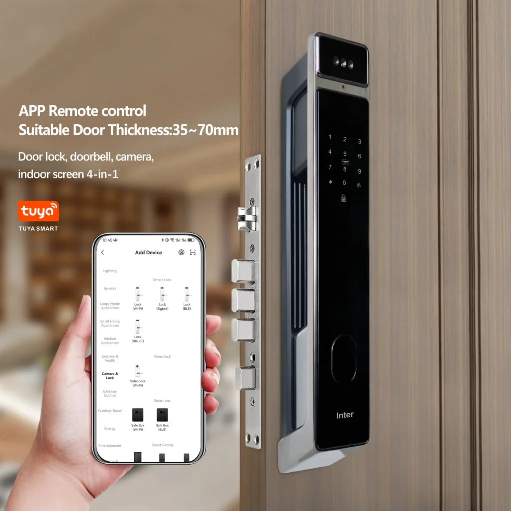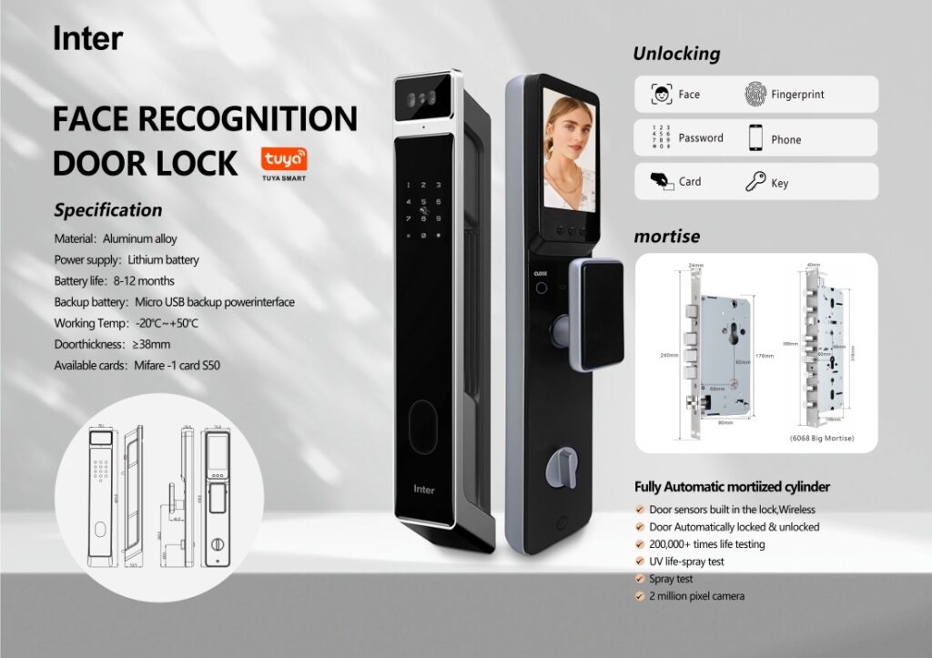 This advanced smart lock combines cutting-edge security with modern convenience, offering six innovative unlocking methods: face recognition, fingerprint scanning, phone unlocking, password entry, card reading, and mechanical key access. Designed with a sleek touch keypad, integrated doorbell, and durable handle with a deadbolt mechanism, it provides superior safety and style for homes and businesses. Featuring a USB charging port for emergency power and a long-lasting battery, this lock ensures reliability and ease of use while complementing any door with its elegant design.