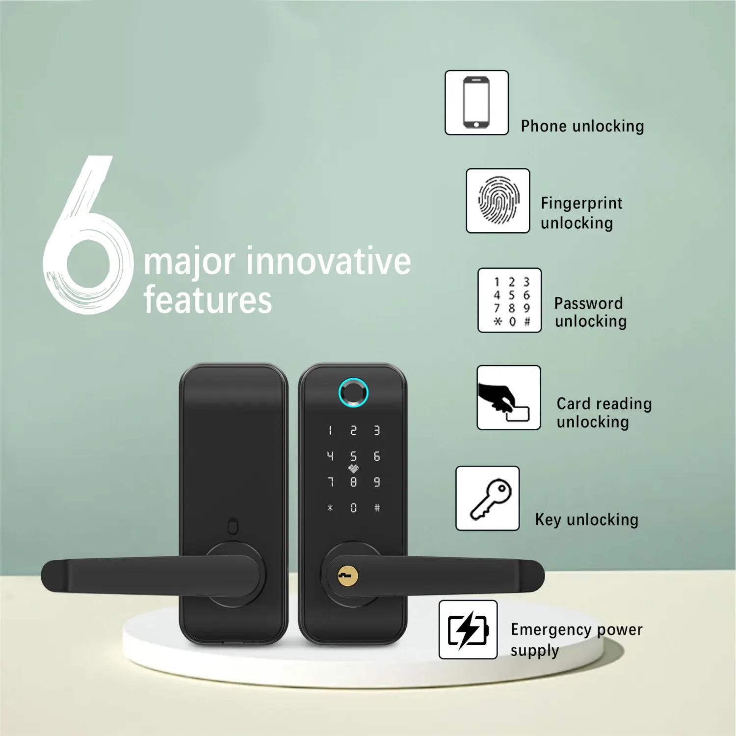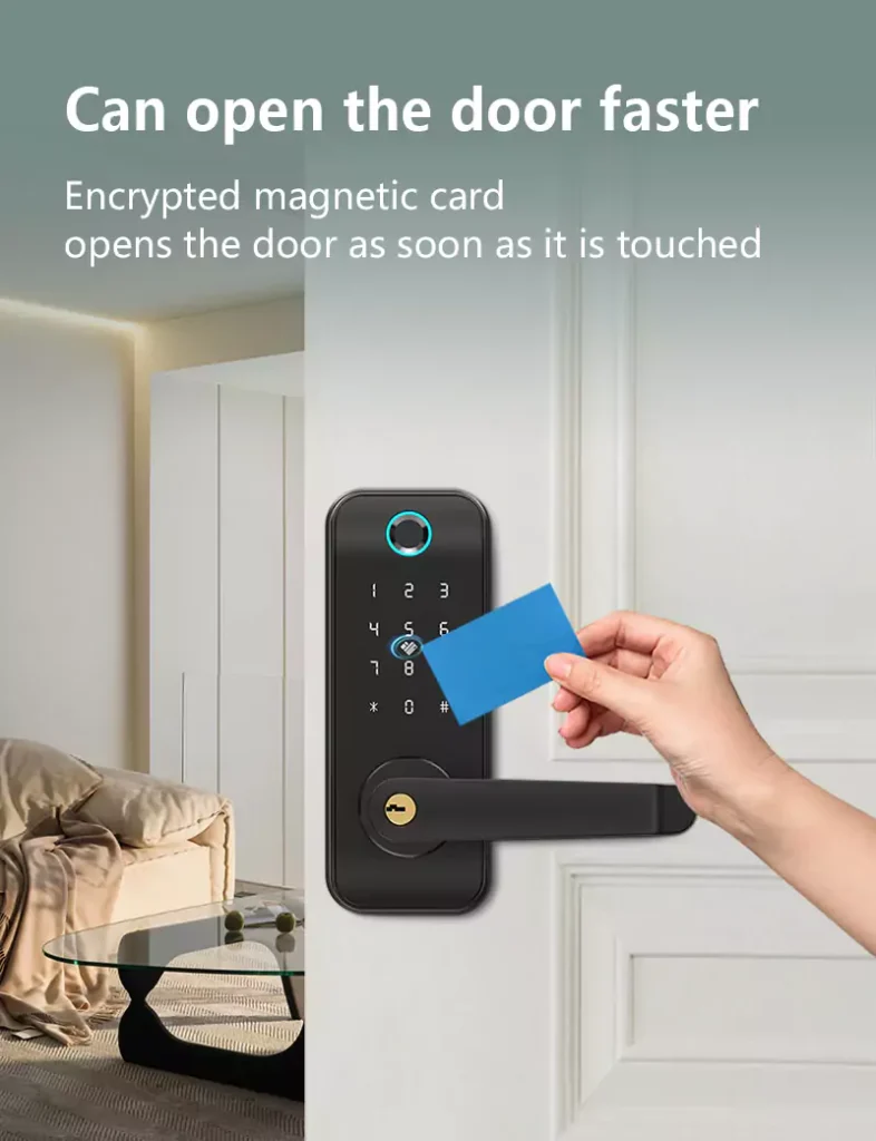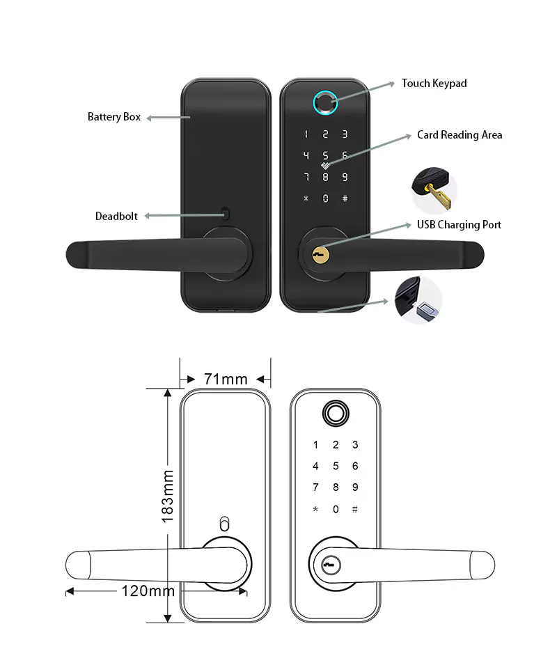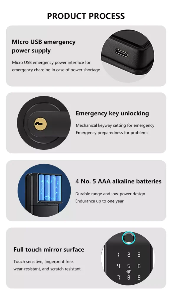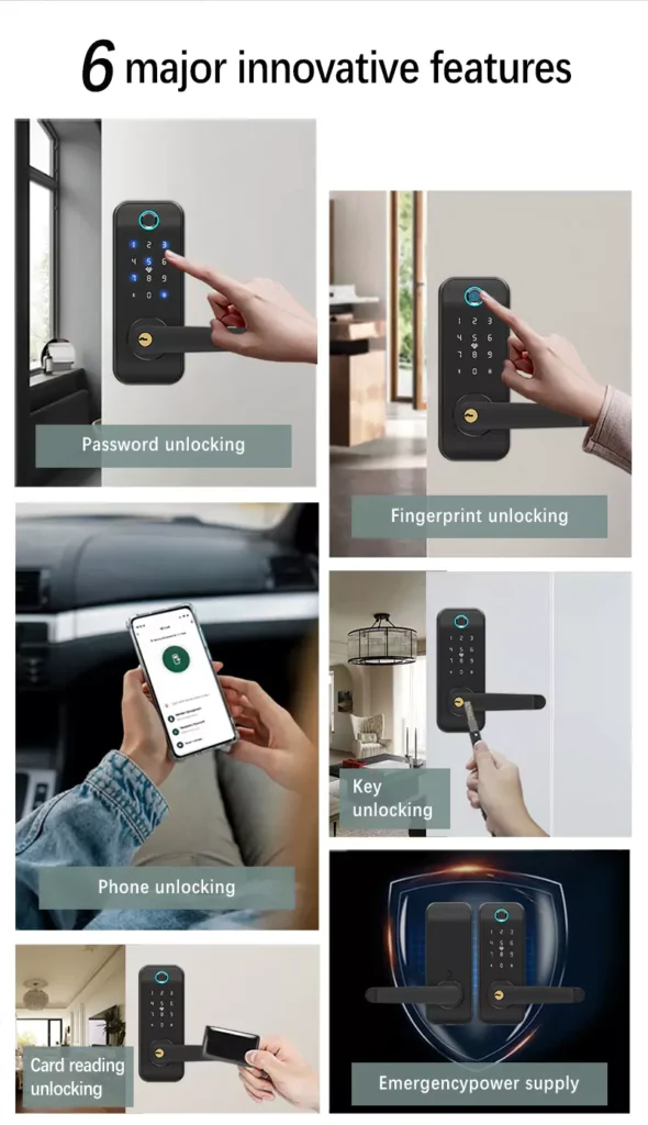 This smart door lock combines advanced security with modern convenience. It features 5 innovative unlocking methods, including fingerprint, phone, and password access, to ensure safety and flexibility. The emergency power supply and mechanical key unlock provide reliable backup solutions, while its sleek, scratch-resistant mirror surface design offers a stylish and durable finish. Ideal for homes or businesses seeking enhanced security with cutting-edge technology.